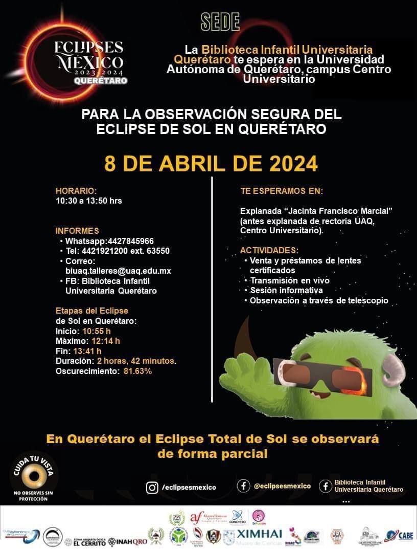 La Universidad Autónoma de Querétaro (UAQ) invitó a la comunidad y población en general a observar de manera segura el eclipse de sol del próximo 8 abril, en la explanada de rectoría del Centro Universitario, en el cerro de las campanas.