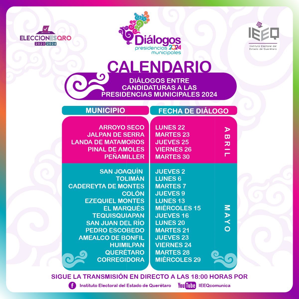 Los Diálogos se realizarán en modalidad virtual y se transmitirán, a partir de las 18:00 horas, en las plataformas sociodigitales del IEEQ en Facebook y YouTube, de acuerdo con el siguiente calendario: Arroyo Seco el 22 de abril, Jalpan de Serra el 23 de abril, Landa de Matamoros el 25 de abril, Pinal de Amoles el 26 de abril, Peñamiller el 30 de abril, San Joaquín el 2 de mayo, Tolimán el 6 de mayo, Cadereyta de Montes el 7 de mayo, Colón el 9 de mayo, Ezequiel Montes el 13 de mayo, El Marqués el 15 de mayo, Tequisquiapan el 16 de mayo, San Juan del Río el 20 de mayo, Pedro Escobedo el 21 de mayo, Amealco de Bonfil el 23 de mayo, Huimilpan el 24 de mayo, Querétaro el 28 de mayo y Corregidora el 29 de mayo.
