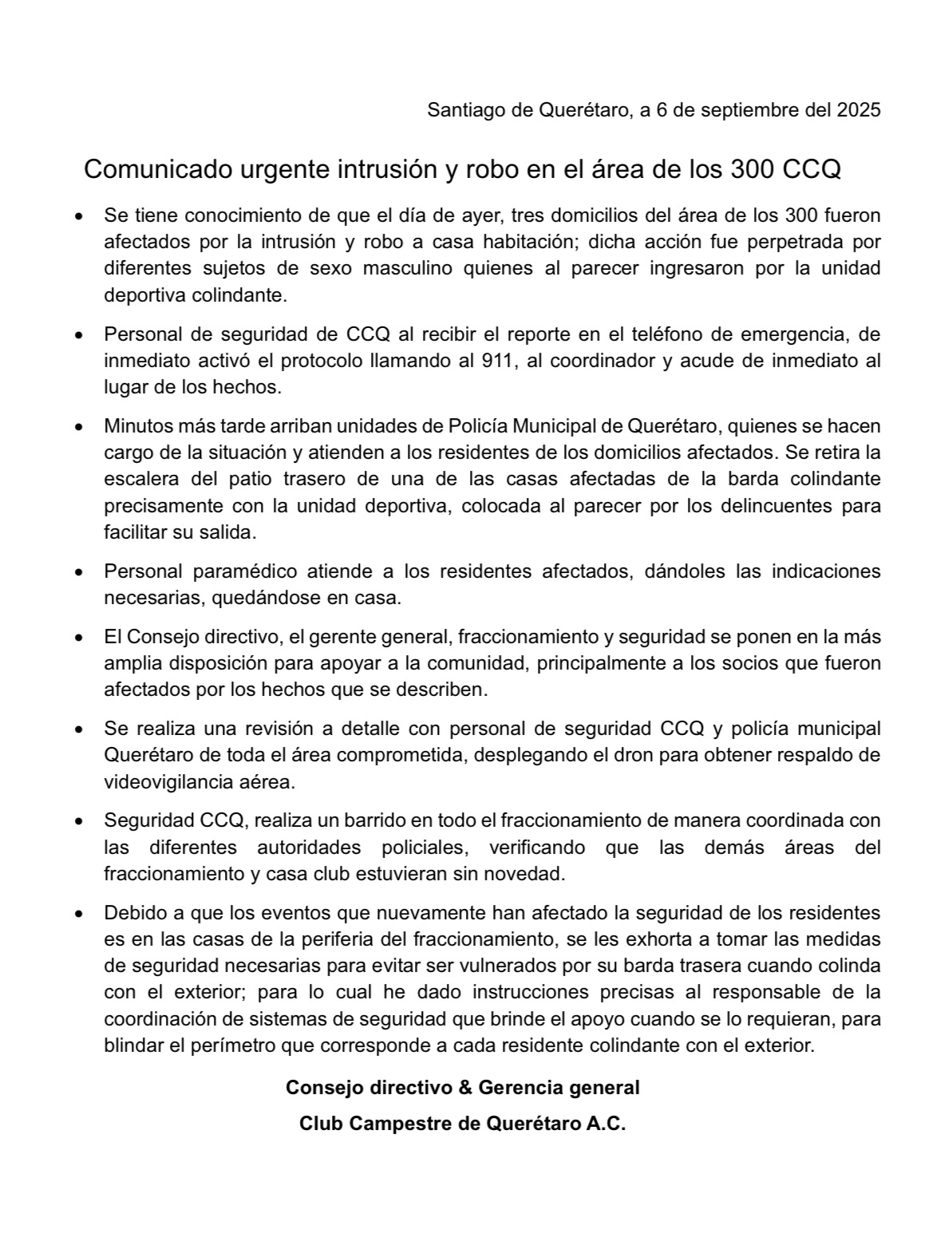 El Consejo Directivo del CCQ reconoció la preocupación de los socios tras este nuevo golpe a la seguridad y exhortó a los residentes cuyas propiedades colindan con el perímetro exterior a reforzar medidas de blindaje en sus bardas traseras, a fin de evitar ser vulnerados nuevamente.