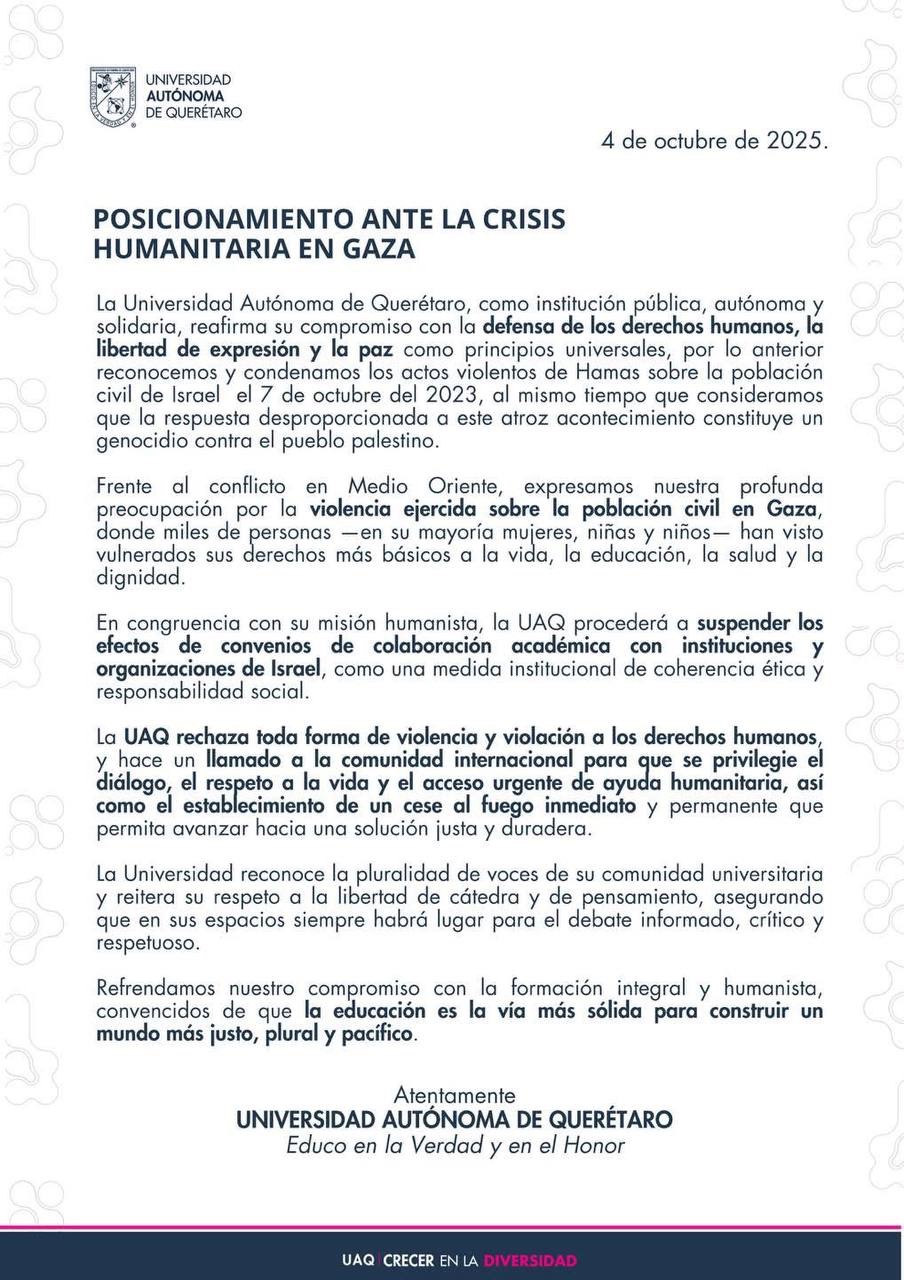 La Universidad Autónoma de Querétaro (UAQ) anunció la suspensión de convenios de colaboración académica con instituciones y organizaciones de Israel, como parte de su posicionamiento ante la crisis humanitaria en Gaza.