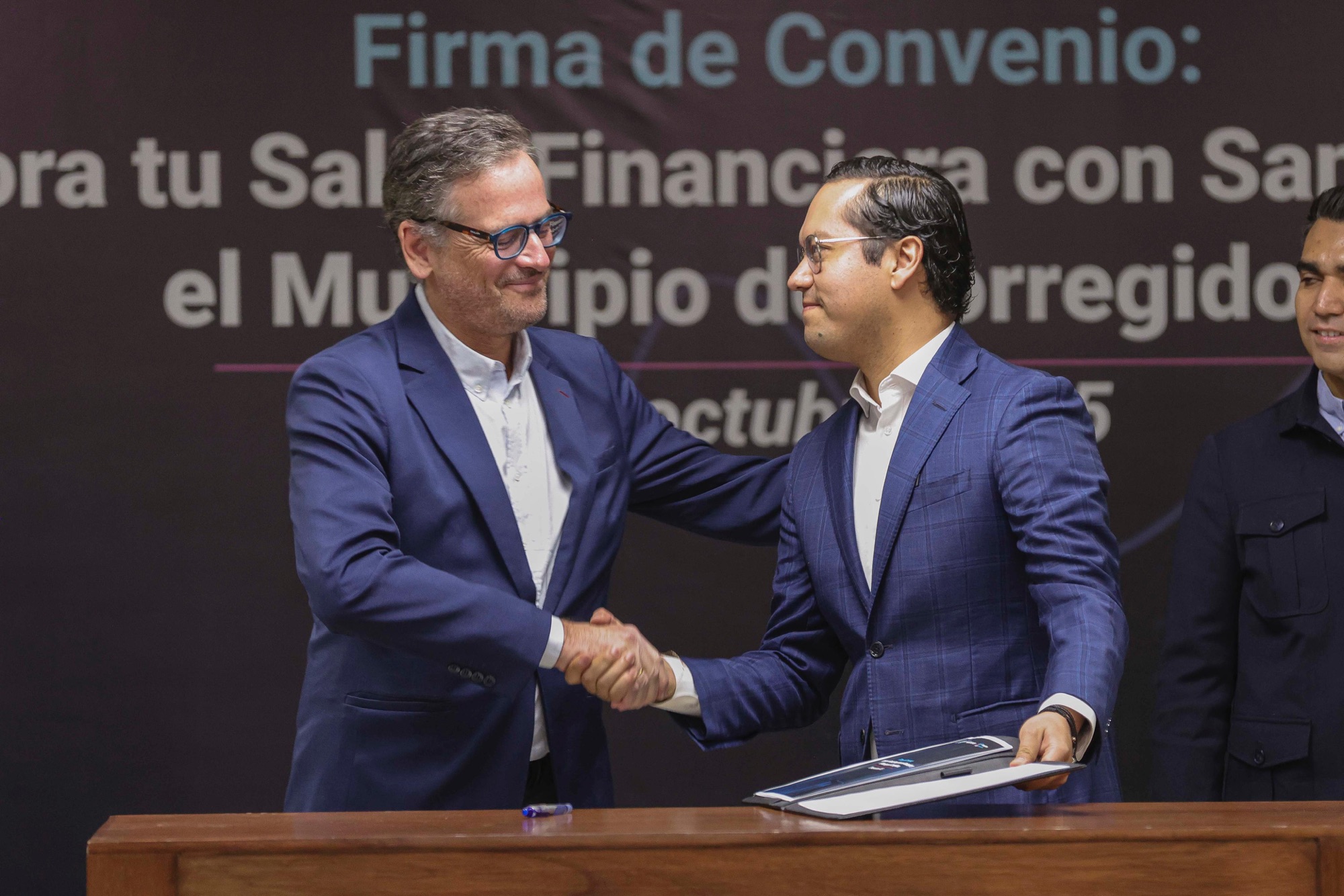 El presidente municipal de Corregidora, Chepe Guerrero y el director ejecutivo de distribución y regionalizaciónde banco Santander México, Antonio Basagoiti, firmaron un convenio para la entrega de mil becas “Salud Financiera” para universitarios, esta iniciativa promueve una mejor administración del dinero, el ahorro y el uso responsable del crédito.