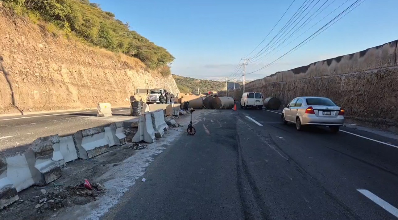 De acuerdo con los primeros reportes, el incidente se originó debido al exceso de velocidad y la falta de precaución del operador, lo que provocó que el vehículo perdiera el control y parte de la carga cayera sobre la cinta asfáltica, impactando el muro de contención y afectando la circulación en ambos carriles.