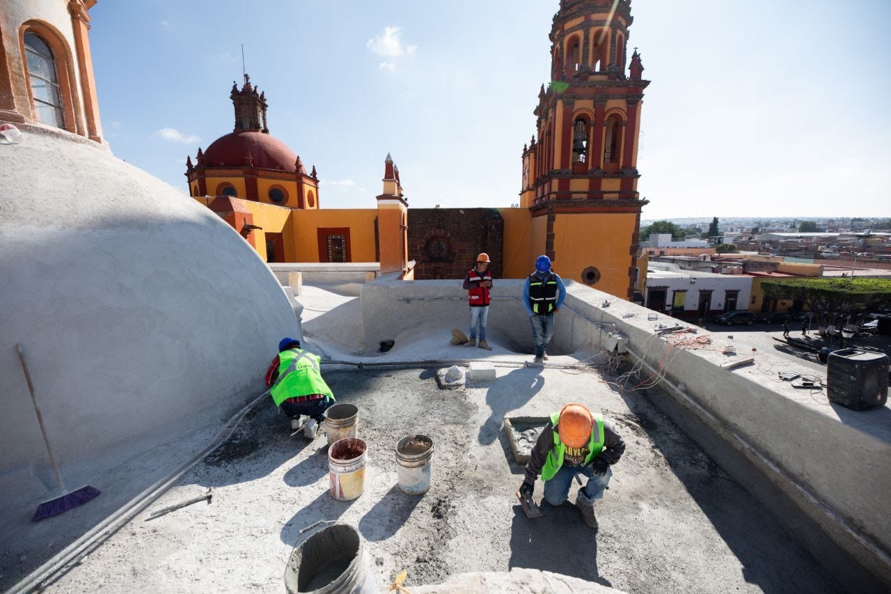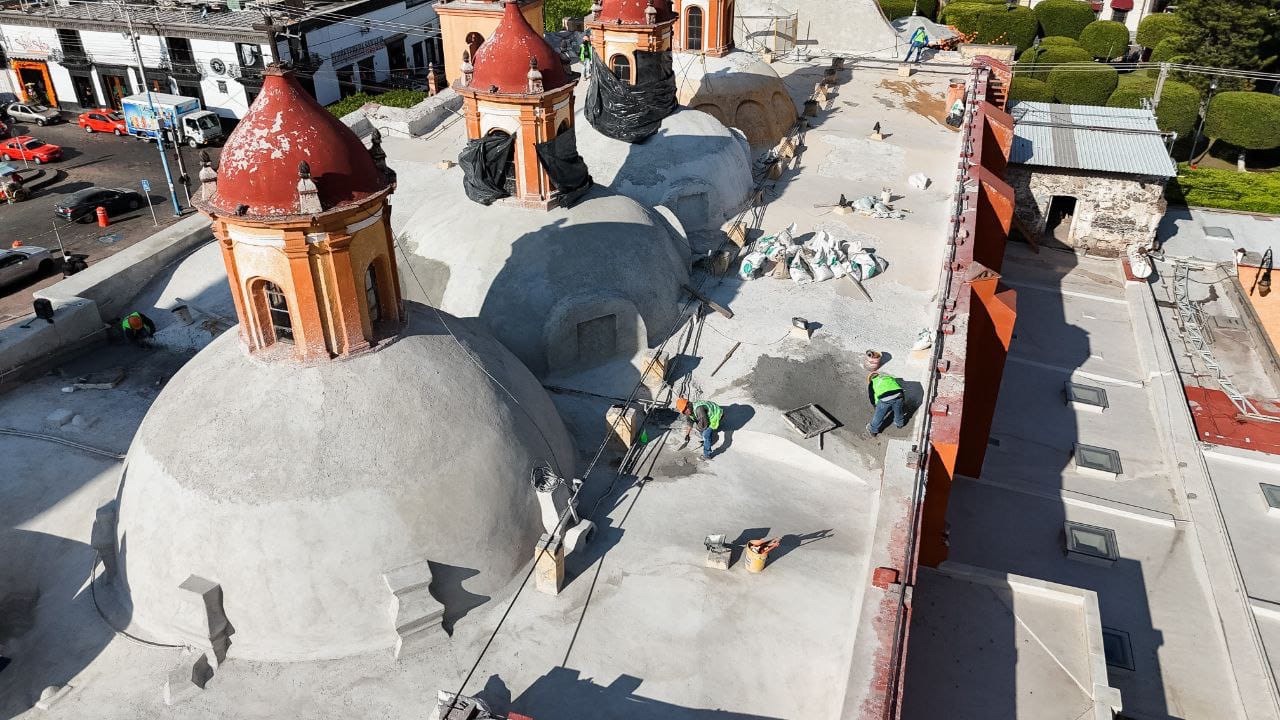 Agregó que las labores consisten, al interior del templo, en el retiro de entortados en mal estado de bóvedas y cúpulas, el retiro de chaflanes en la nave principal, linternillas y campanario, así como el retiro de aplanados en mal estado. En el exterior, enlistó, se trabaja en la limpieza de cantera, lavado de pretiles y muros de mampostería, inyección de grietas, aplanados en muros, pintura a la cal, restauración de portones y pintura de esmalte en herrería.