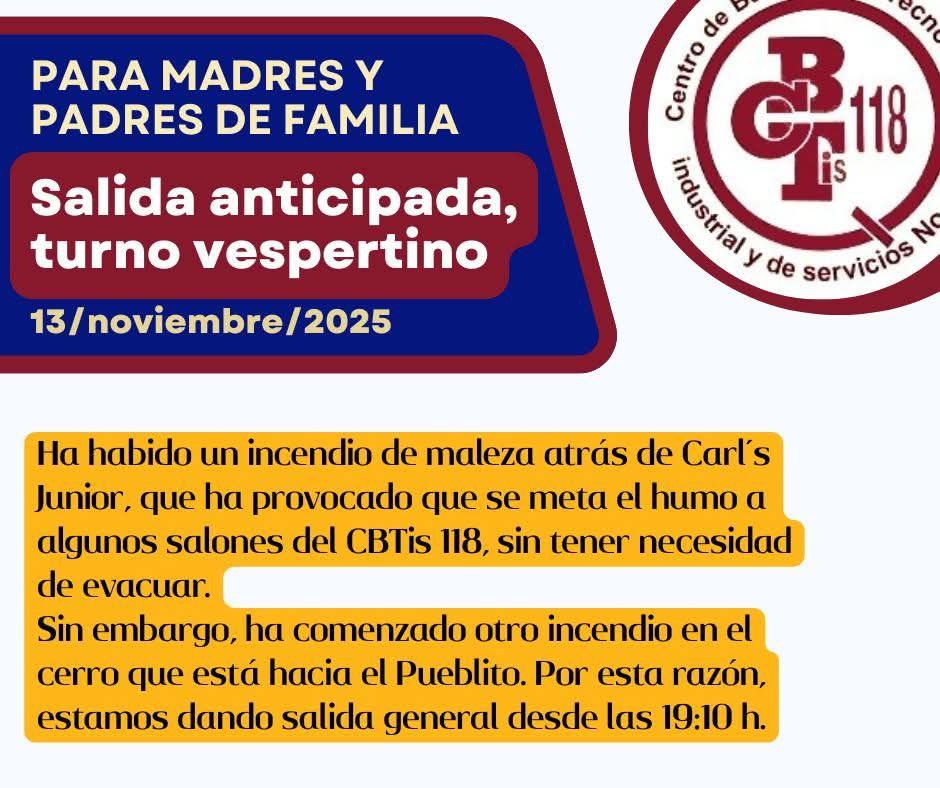 La tarde de este jueves, autoridades del CBTis 118, ubicado en el municipio de Corregidora, determinaron realizar una salida anticipada para el alumnado del turno vespertino, luego de que dos incendios de maleza registrados en las inmediaciones generaran presencia de humo en algunas aulas.