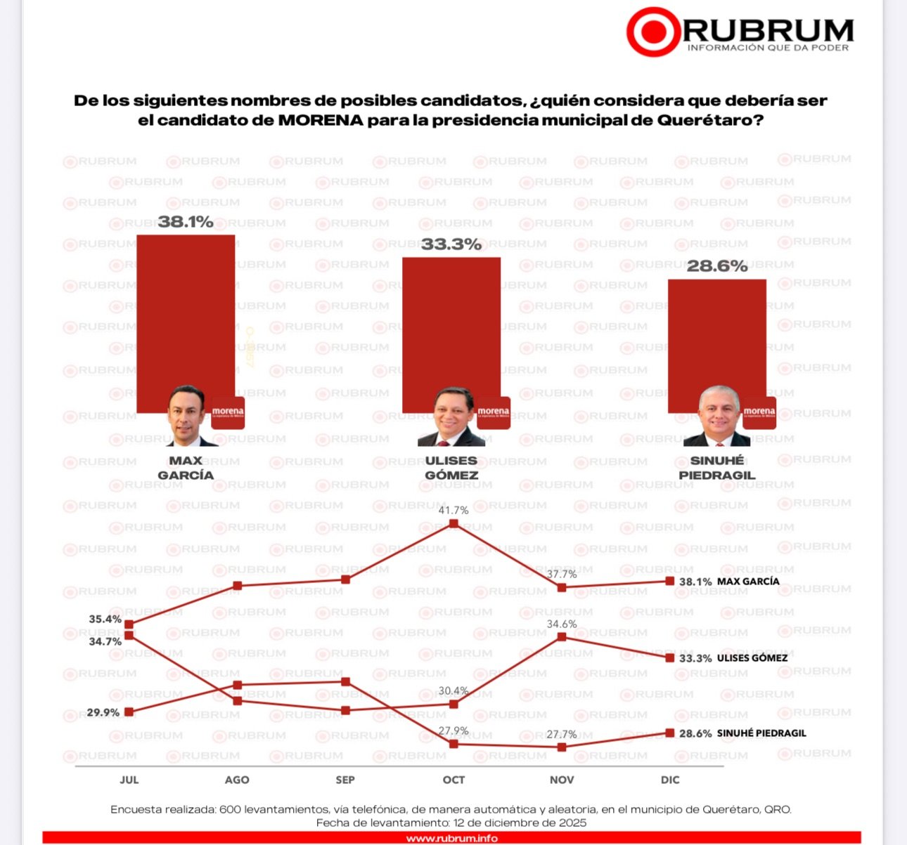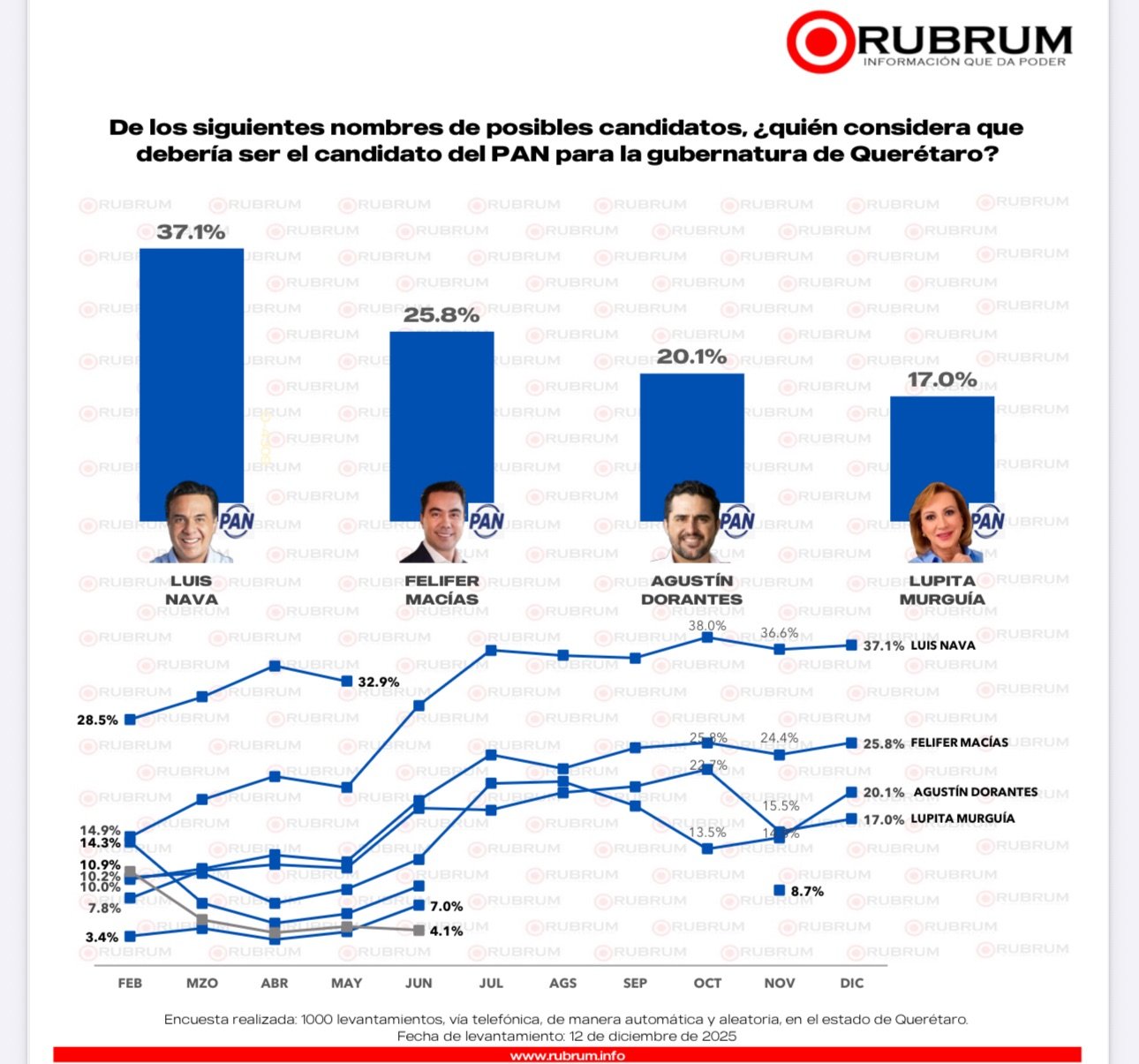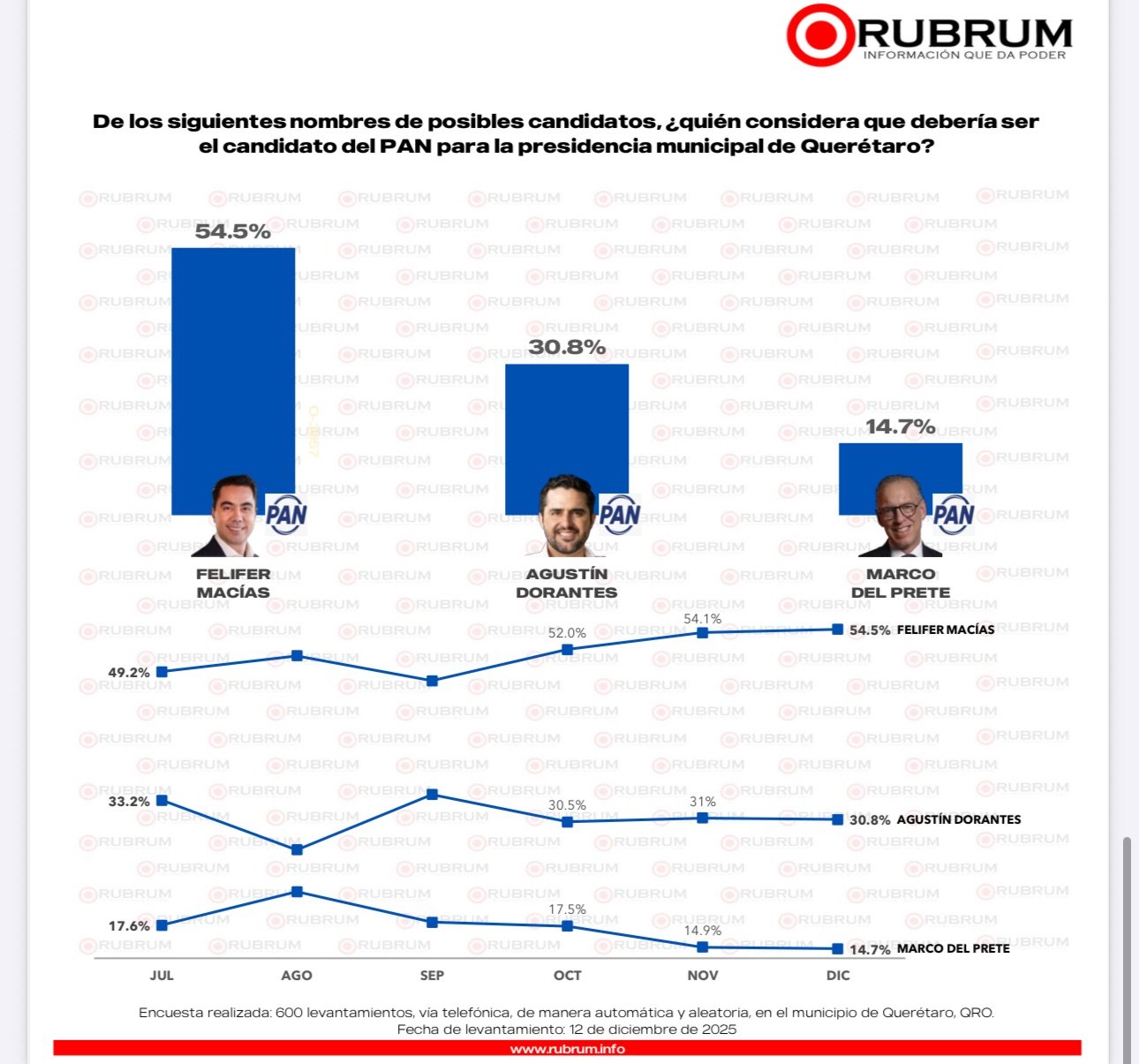 RUBRUM también midió las preferencias para la presidencia municipal de Querétaro. En el PAN, Felifer Macías se coloca en primer lugar con 54.5%, seguido de Agustín Dorantes con 30.8% y Marco del Prete con 14.7%.
