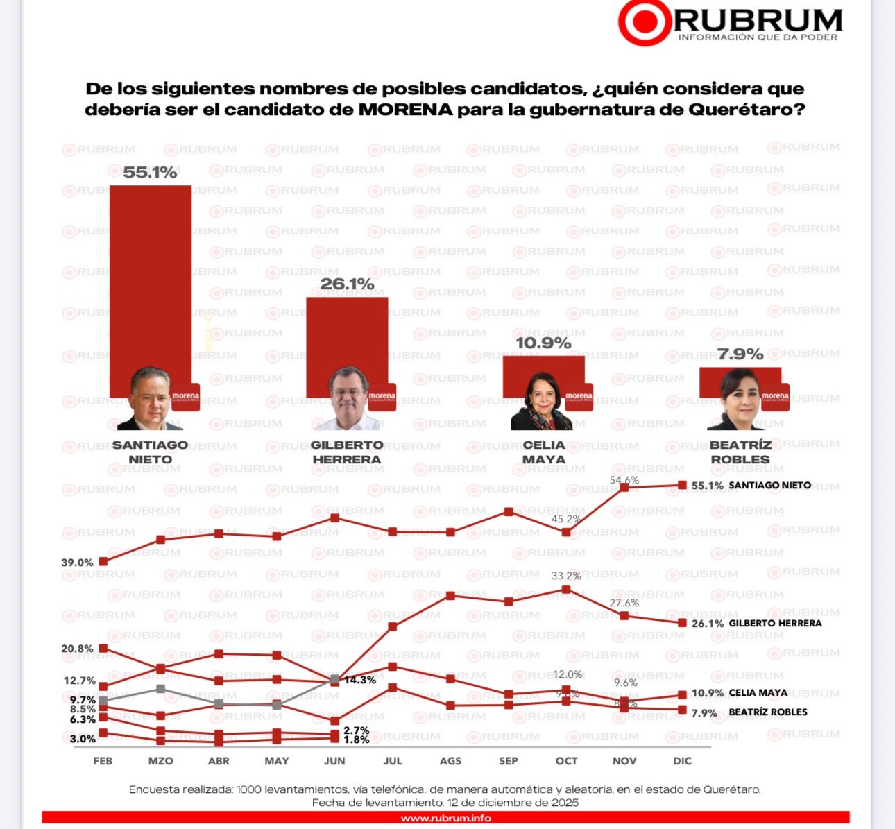 En el caso de MORENA, Santiago Nieto lidera de forma amplia con 55.1%, mientras que Gilberto Herrera registra 26.1%, Celia Maya 10.9% y Beatriz Robles 7.9%.