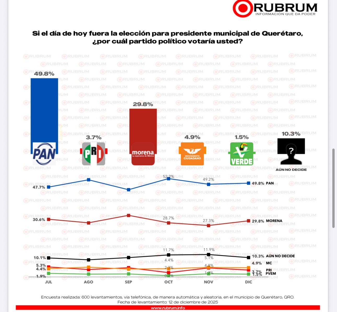 La más reciente medición de RUBRUM, “información que da poder”, perfila el escenario rumbo a la elección de la gubernatura de Querétaro en 2027. En la preferencia por partidos, el PAN se mantiene al frente con 46.5%, seguido de MORENA con 34.3%. Más atrás aparecen Movimiento Ciudadano con 4.9%, el PRI con 4.2%, mientras que 10.2% de los encuestados aún no define su preferencia.