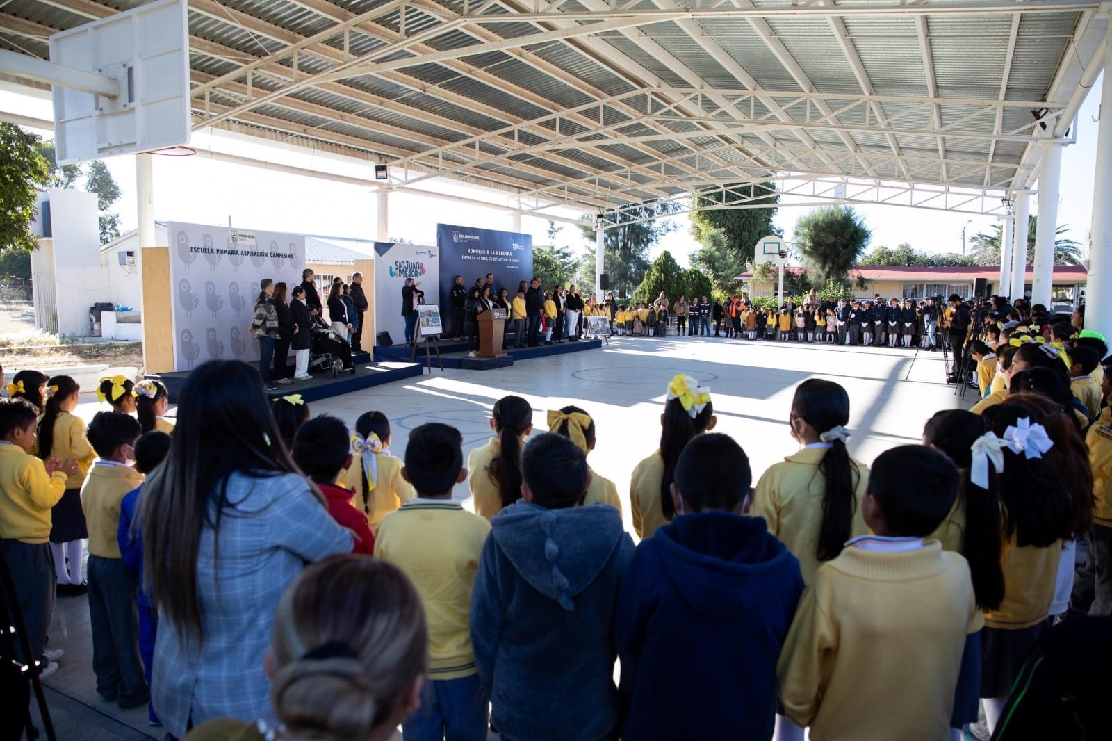 Antes del corte inaugural de los tres salones de clase, Roberto Cabrera encabezó la ceremonia de honores a la Bandera. Durante su mensaje, el alcalde sanjuanense destacó que la escuela es una institución donde se fomentan y promueven los valores, con lo cual, afirmó, se fortalecen las líneas del Plan Municipal de Desarrollo para tener una Mejor Ciudad, una Mejor Sociedad, con un Mejor Gobierno.