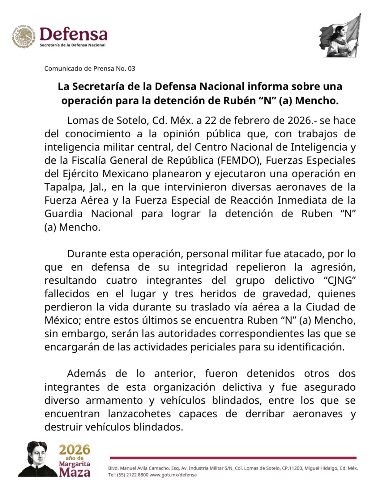Se hace del conocimiento a la opinión pública que, con trabajos de inteligencia militar central, del Centro Nacional de Inteligencia y de la Fiscalía General de República (FEMDO), Fuerzas Especiales del Ejército Mexicano planearon y ejecutaron una operación en Tapalpa, Jal., en la que intervinieron diversas aeronaves de la Fuerza Aérea y la Fuerza Especial de Reacción Inmediata de la Guardia Nacional para lograr la detención de Ruben “N” (a) Mencho.