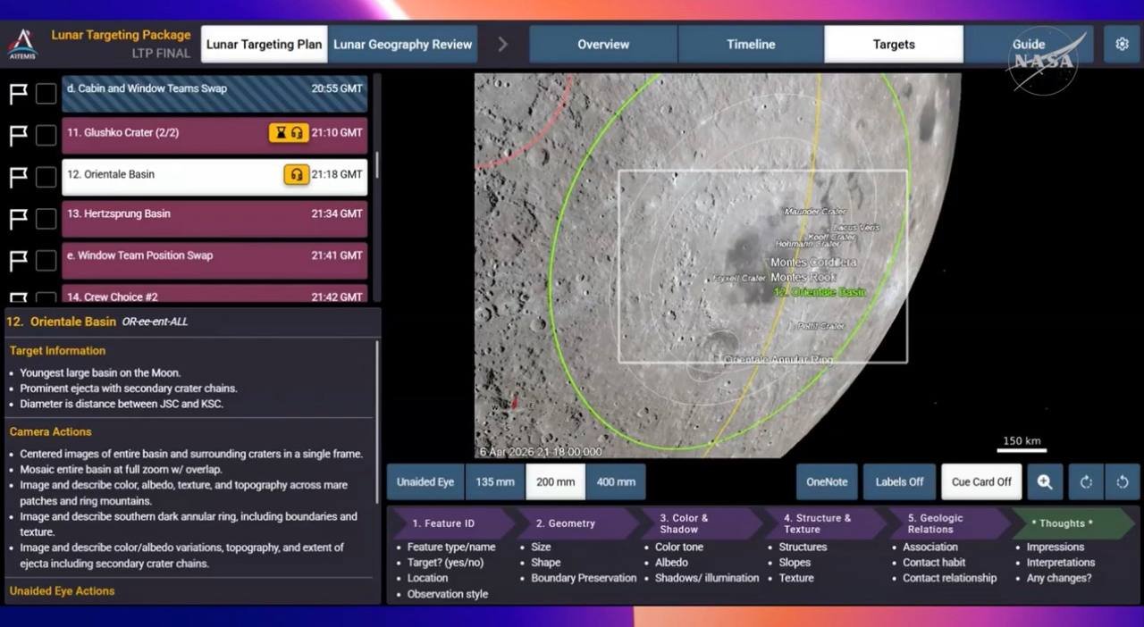 Los astronautas documentarán regiones poco exploradas como el Mare Orientale y otras formaciones geológicas.
