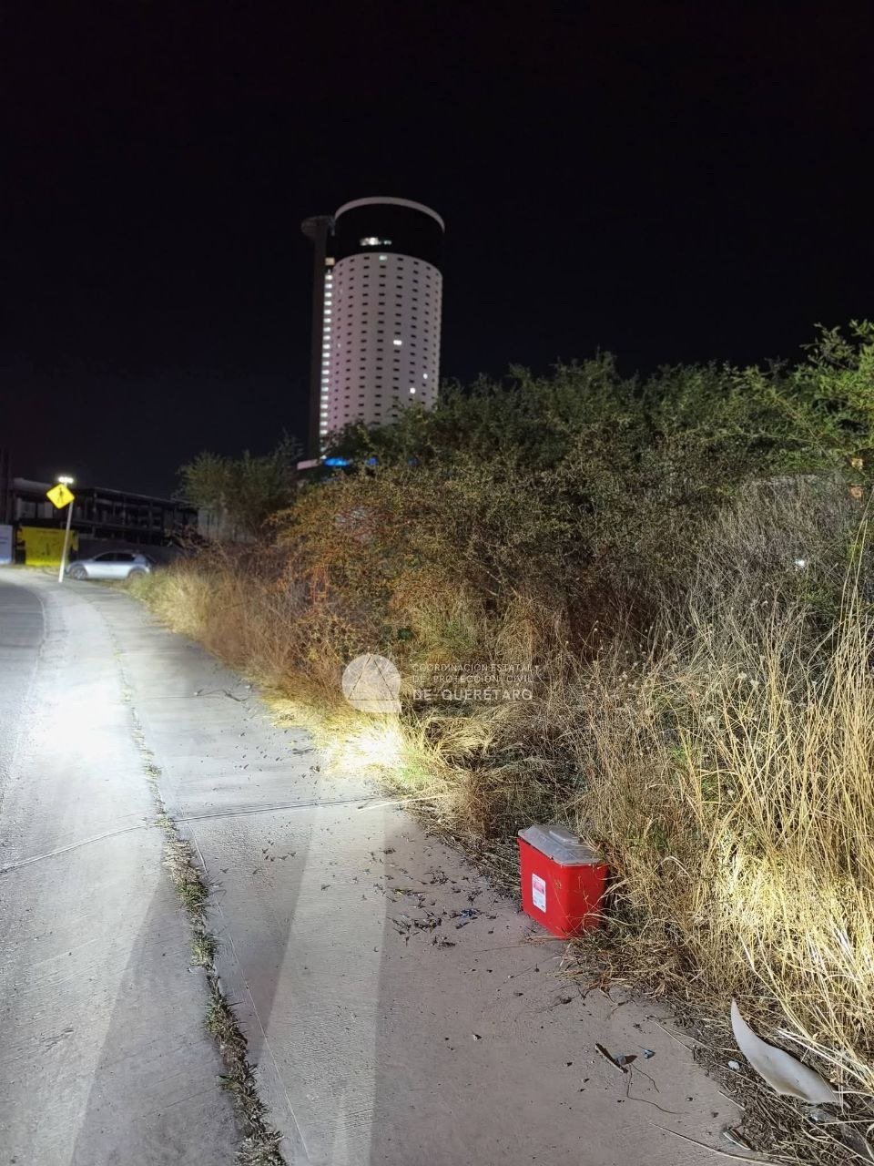 Personal de atención a emergencias retiró un contenedor con Residuos Peligrosos Biológico-Infecciosos (RPBI) que fue localizado en la vía pública en la colonia Juriquilla, en la capital queretana.