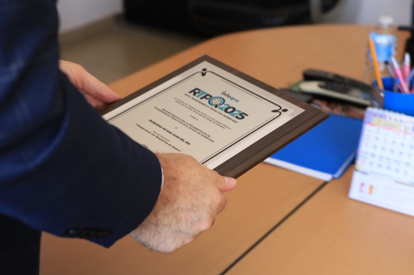 •El reconocimiento fue entregado al alcalde Roberto Cabrera Valencia, por el comisionado presidente de INFOQRO, Javier Marra Olea, en las instalaciones de Centro Cívico.