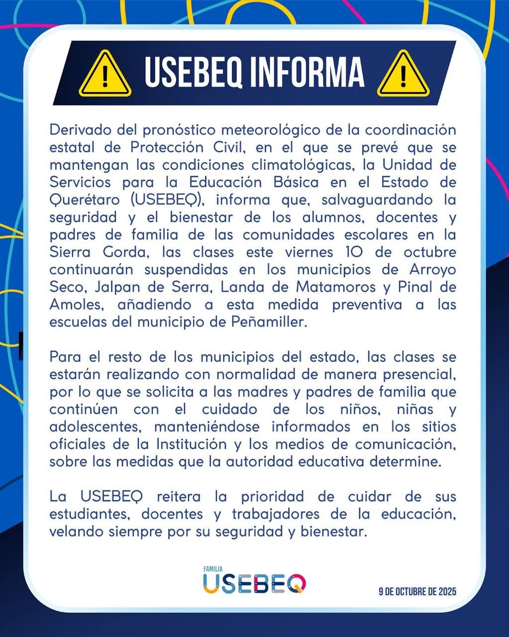 USEBEQ mantiene suspensión de clases en la Sierra Gorda y Peñamiller por lluvias