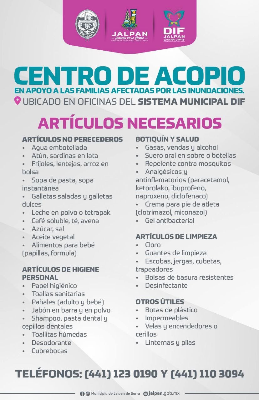 ¡Súmate! Jalpan abre centro de acopio para ayudar a los afectados por las lluvias